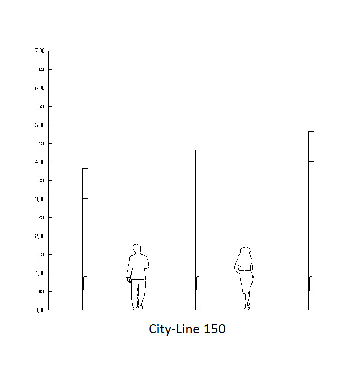 Gehäuse: | Stelenrohr 150 mm Ø aus Aluminium-Strangpressprofil mit Bodenflansch oder durchgehendem Erdstück, mit Masttür 110 x 300 mm, Höhe 2.500 mm, optional 3.000 mm oder 3.500 mm. Alternativ mit flachem Dach aus Aluminium Ø 500 mm (andere Maße optional) |