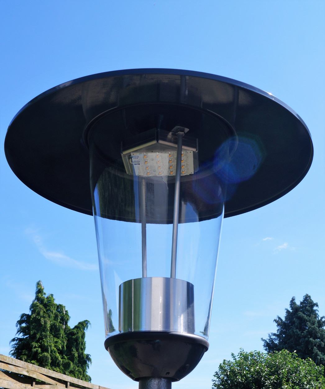 High-Power LED 1.100 lm bis 3.000 lm, 3.000° K - im oberen Teil der Leuchte. (Alternativ 4.000° K) Symmetrische oder asymmetrische blendfreie Lichtverteilung mittels hochwertiger LEDIL-Linsentechnik 10 W bis 28 W. Dimmbarer und programmierbarer Treiber (DALI) nach Wahl, gemäß Prüfnorm IEC-61643-11. |